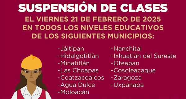 Por las lluvias derivadas del Frente Frío 28 y su masa ártica en Veracruz, el Gobierno del Estado suspende clases en todos los niveles educativos de 13 municipios del sur: Agua Dulce, Coatzacoalcos, Cosoleacaque, Hidalgotitlán, Ixhuatlán del Sureste, Jáltipan, Las Choapas, Minatitlán, Moloacán, Nanchital, Oteapan, Uxpanapa y Zaragoza.