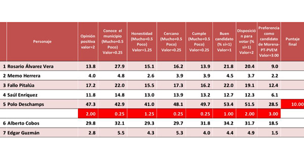 Polo Deschamps obtuvo 2 puntos en el valor de opinión positiva; 0.25 en el de conocimiento del municipio; 1.25 en el de honestidad; 0.25 en el de cercanía con la gente; 0.25 en el de cumple lo que dice; 1 en el de buen candidato; 2 en el de disposición a votar por él y 3 en el de preferencia como candidato de Morena.