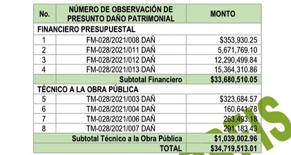Ese año (2021) también obtuvo 26 observaciones de probable daño patrimonial a la obra pública. En conjunto entre observaciones de carácter financiero y a la obra pública; cayó en probable daño patrimonial de 34 millones 719 mil 513 pesos.