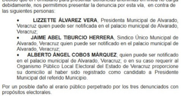 El documento fue enviado vía correo electrónico debido a fallas técnicas en el portal oficial para denuncias anónimas. En él se especifica que los señalados pueden ser notificados directamente en el Palacio Municipal de Alvarado o, en el caso de Cobos, también ante el Organismo Público Local Electoral de Veracruz (OPLEV), dado que presuntamente ya se encuentra registrado como candidato.
