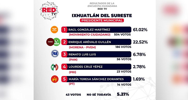 Los resultados de las primeras encuestas, análisis de contenidos y redes sociales, aplicados durante en los primeros veinte días de campaña en Ixhuatlán del Sureste revelan tendencia de crecimiento a favor de Raúl González Martínez, candidato de Movimiento Ciudadano.