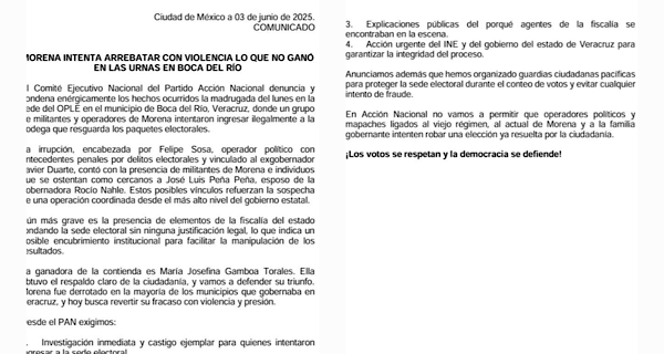 El Comité Ejecutivo Nacional del Partido Acción Nacional denuncia y condena enérgicamente los hechos ocurridos la madrugada del lunes en la sede del OPLE en el municipio de Boca del Río, Veracruz, donde un grupo de militantes y operadores de Morena intentaron ingresar ilegalmente a la bodega que resguarda los paquetes electorales.