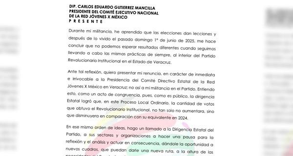 En un carta dirigida a Carlos Eduardo Gutiérrez Mancilla, presidente del Comité Ejecutivo Nacional de la Red Jóvenes X México, señala que ha aprendido que las elecciones dan lecciones y después de los comicios del 1 de junio de 2025, “me hace concluir que no podemos esperar resultados diferentes cuando seguimos llevando las mismas prácticas de siempre al interior del PRI en el estado de Veracruz”.