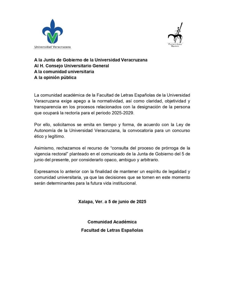 Nosotros, académicas y académicos, estudiantes, personal administrativo, egresados y miembros de esta comunidad universitaria que aún cree en el valor de la verdad, la justicia y la educación como servicio público, alzamos la voz y los principios ante la barbarie disfrazada de procedimiento.