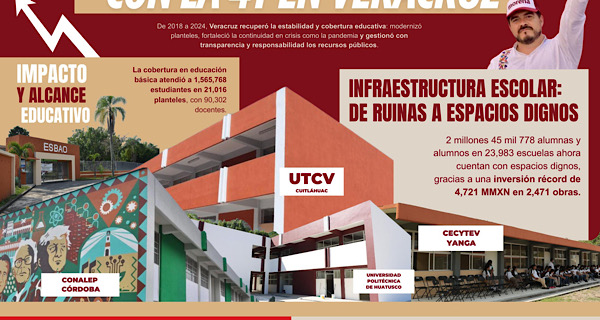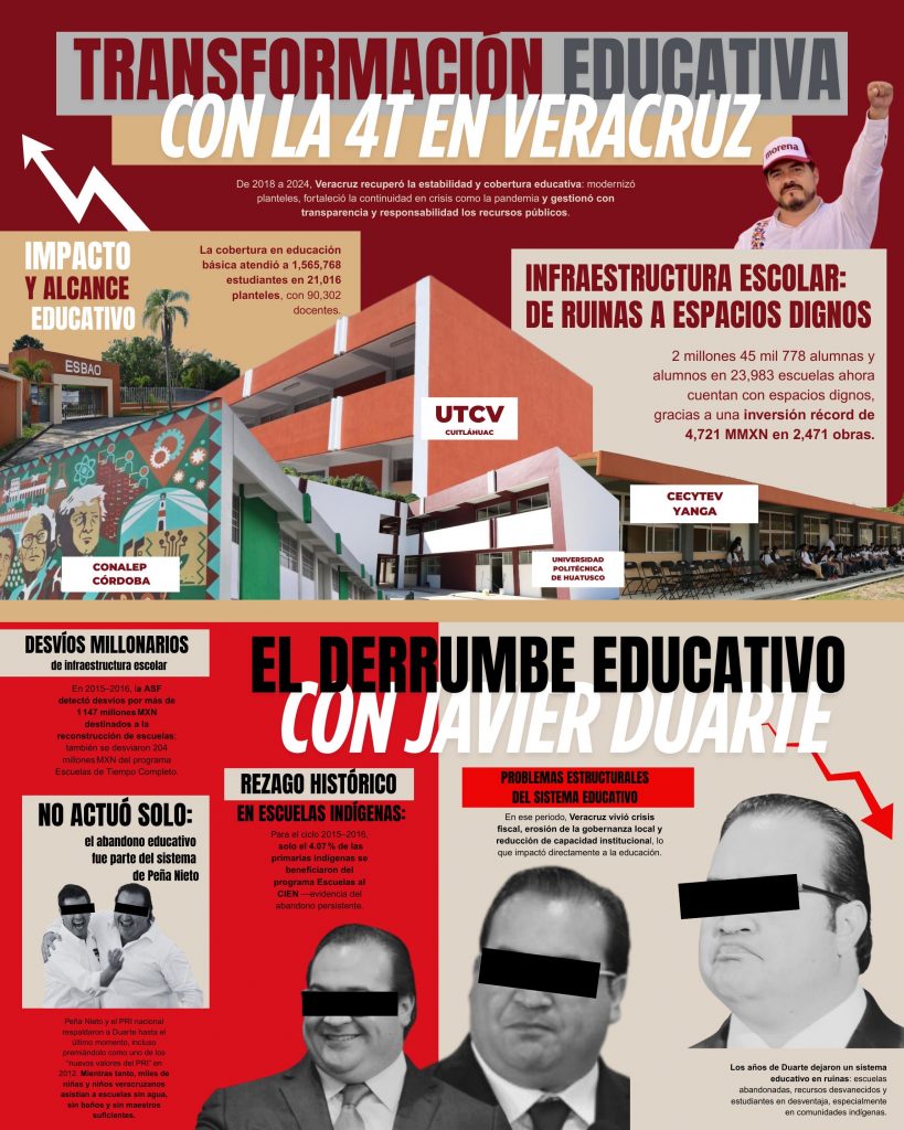 Abundó: durante la administración de Duarte, el sistema educativo estuvo en ruinas; con escuelas abandonadas, recursos desvanecidos y estudiantes en desventaja, especialmente en comunidades indígenas; en cambio, en los años de la 4T se ha registrado un rescate del sector; ya no hay infraestructura educativa en ruinas, sino espacios dignos; se logró, por ejemplo, una inversión récord de 4,721 millones de pesos en más de 2,400 obras; y la cobertura educativa básica atendió a 1,565,768 estudiantes de más de 21,000 planteles, con 90,302 docentes.