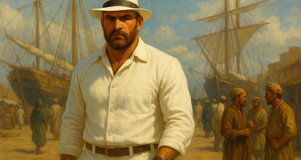 “Faltaríanle una o acaso dos pulgadas para tener los seis pies ingleses de altura; era fornido, y, al abordar a la gente, hacíalo combado ligeramente de hombros, avanzando la cabeza y con la mirada fija, profunda, bajo el dosel de las cejas, de tal suerte que evocaba el recuerdo de un toro en el momento de embestir. Recia y alta, como él, era también su voz, y en su porte echábase de ver una especie de ceñudo aplomo que nada tenía de agresivo. Parecía obedecer más bien a cierta necesidad de su temperamento, y podía presumirse que tanto rezaba aquel aire consigo como con los demás. Era intachablemente limpio, vestido de inmaculado blanco desde los zapatos hasta el sombrero, y en los varios puertos orientales en que se ganaba el sustento como corredor de agencias proveedoras de barcos, había llegado a adquirir gran popularidad.
