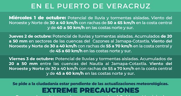 Viernes 3 de octubre: Potencial de lluvias y tormentas aisladas. Acumulados de 20 a 50 mm entre las cuencas del Nautla al Jamapa-Cotaxtla. Viento del Noroeste y Norte de 30 a 40 km/h con rachas de 55 a 70 km/h en la costa central y de 45 a 60 km/h en las costas norte y sur.
