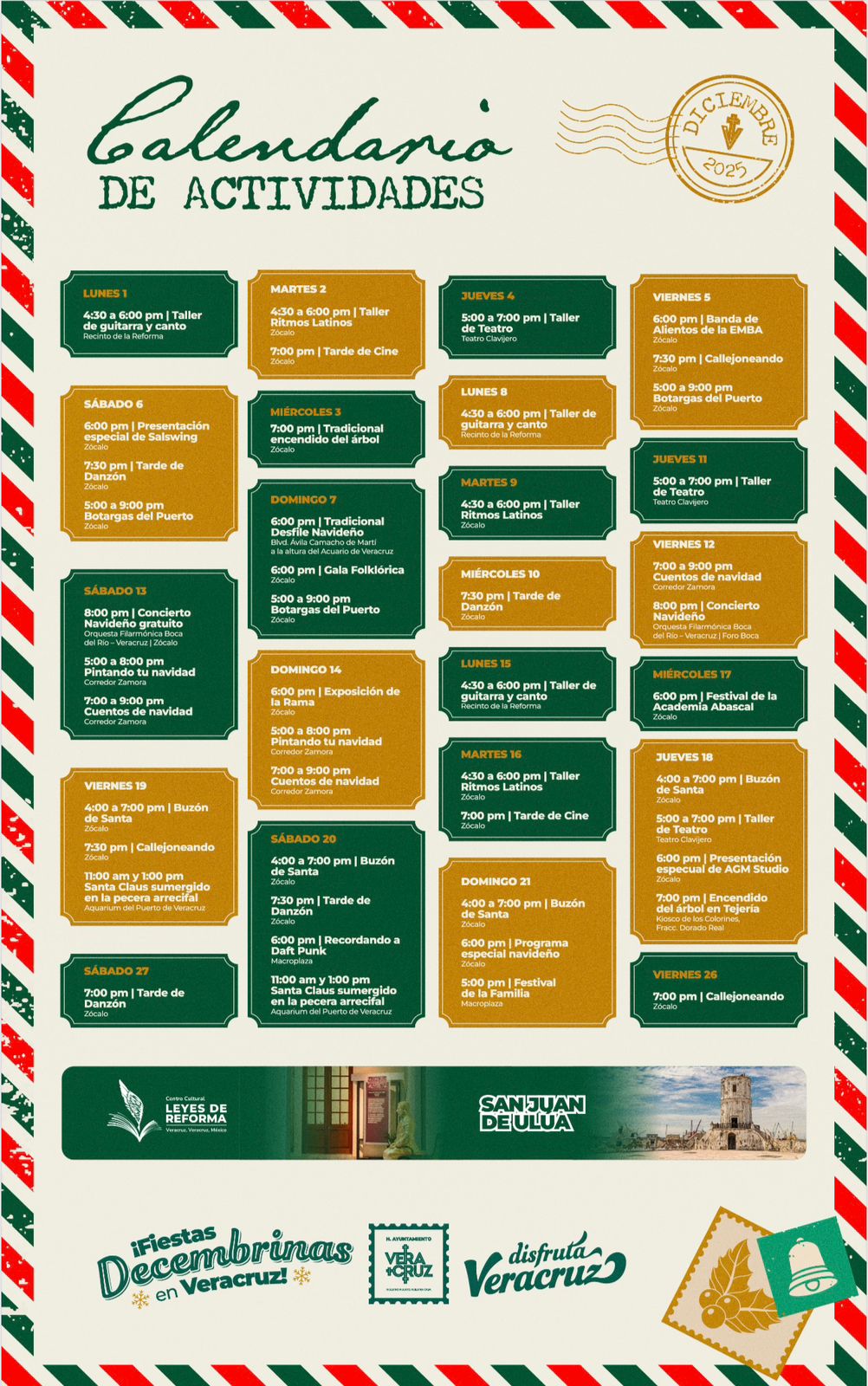 Del 12 al 14 de diciembre, en el Corredor Zamora y el Zócalo se presentarán diversas actividades como Cuentos de Navidad, el taller Pintando tu Navidad y la tradicional presentación de la Rama Veracruzana.