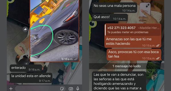 «Ahí me cierra el carro me lo atraviesa por completo se baja con un arma en la mano y me empezó a pegar en el vidrio de mi carro, obviamente pues yo me asusté y le pisé y ya más gente le empezó a atravesar el carro, se armó un merequetengue ahí y gracias a los automovilistas pude salir de ahí, el tipo se quedó ahí discutiendo, como pudo salió me da alcance nuevamente en el semáforo de Allende y Xalapa, logro pasarme las luces me sigo de largo y ya el tipo como vio que lo venían siguiendo los otros automovilistas dobló hacia Allende, nosotros empezamos a reportar el 911, era un carro Mazda color gris, el hombre va armado. Como a los 5 minutos me entra el mensaje de Maddie Hernández y le pregunto cómo conseguiste mi número, ahorita te envío las capturas para que veas lo que me escribe. Entonces, yo no tengo problema con nadie, la única persona que me está hostigando en Las Amapolas porque ahí vivo, que me dijo que tiene instrucciones de que me va a correr de Las Amapolas», dio a conocer.
