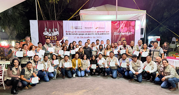 La entrega de estos reconocimientos al personal que brindó apoyo en auxilio a la población se dio en el marco de la reunión de fin de año, en reconocimiento a la entrega y compromiso de las y los trabajadores de Bienestar Veracruz, así como por su vocación de servir al pueblo en los momentos más críticos, siguiendo las instrucciones de la presidenta Claudia Sheinbuam, de la secretaria de Bienestar, Ariadna Montiel Reyes, y en coordinación con la gobernadora Rocío Nahle García.