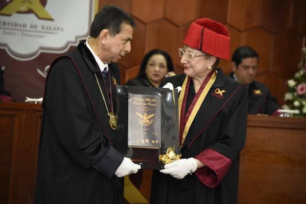 La distinción fue otorgada por las máximas autoridades de la Universidad de Xalapa, el Rector Carlos García Méndez, la Rectora Emérita, Isabel Soberano de la Cruz, el Vicerrector, Erik García Herrera, y el Magister Laudi, Carlos García Herrera; quienes se hicieron acompañar por el claustro académico de esta máxima casa de estudios, conformado por Susana Sarur Zanatta, Héctor Pedro Montes de Oca, Sergio Hernández Méndez, Rocío Tlexothtli Rodríguez García, Rafael Díaz Sobac y Sergio Amante Haddad.