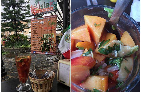 ¿Cuál es su platillo favorito de la carta? Le pregunto. De inmediato responde el coctel de coco y mango, tiene que probarlo. Y bueno, como no me gusta hacerme de la boca chiquita, que me sirven un coctel con toda la apariencia de los de camarón pero efectivamente, con coco y durazno.