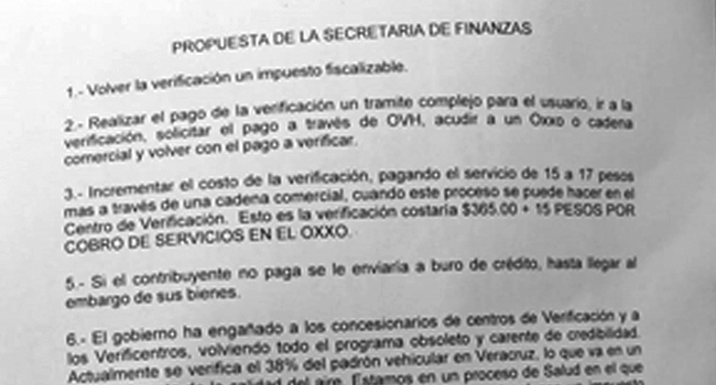 El presidente de la Asociación de Verificentros Ambientalistas por Veracruz, Alejandro Huesca Sota, explicó que no tienen ningún argumento legal que los justifique a hacer lo que se pretende hacer «quieren ingresar la propuesta a las comisiones de Hacienda y de Medio Ambiente para aprobarla a inicios del próximo año.»