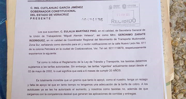 «Señor gobernador solicitamos de la manera más atenta que de manera urgente se le dé una adecuación a las tarifas de taxis autorizadas en todo el estado, pues no queremos estar en la ilegalidad, y por otro lado no podemos cobrar las tarifas tan irrisorias que existen actualmente».