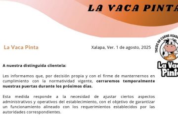 La gerencia de La Vaca Pinta informa a su distinguida clientela que, por decisión propia y con el firme compromiso de cumplir con la normatividad vigente, el establecimiento ubicado en Xalapa cerrará sus pue...